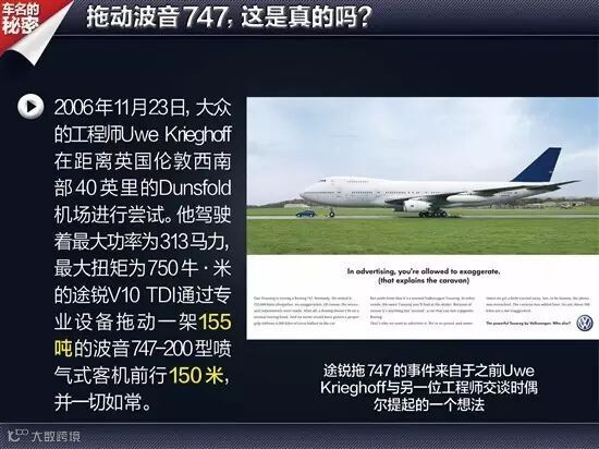 1架波音747-200型喷气式客机大约等于多少辆途锐?这道数学题不管以哪种方法计算,其结果大概都不会少于10。可是途锐拖动了它,并前行150米后一切如常。觉得不可思议?那就准备好你的惯性思维,准备随时颠覆中!
