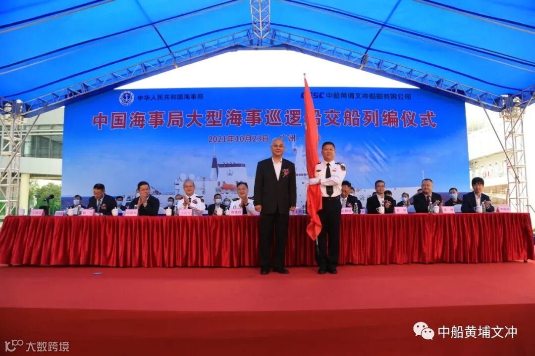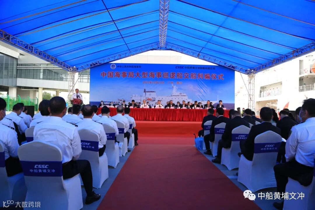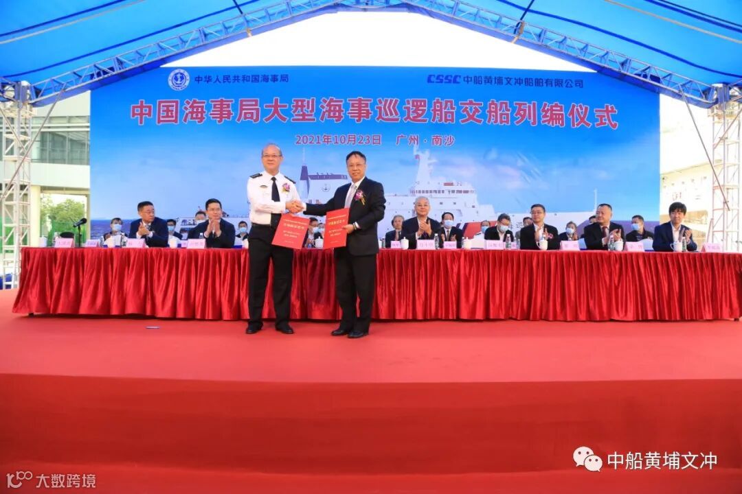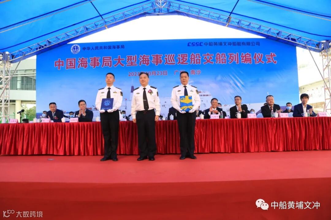 10月 23 日,我国首艘万吨级海事巡逻船、全球首艘智能大型公务船“海巡 09”轮在广州南沙交付列编,加入中国海事执法序列,这标志着我国目前吨位最大、装备先进、综合能力强,具有世界领先水平的公务执法船正式投入使用。该船隶属广东海事局,由中国船舶集团旗下中船黄埔文冲船舶有限公司(黄埔文冲)建造、701所设计。