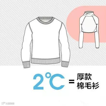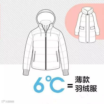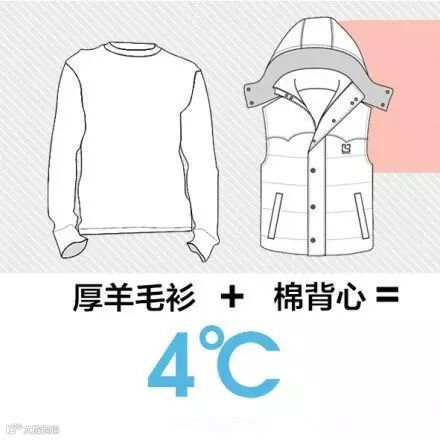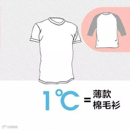举例说,较厚的羽绒服相当于9℃,薄款羽绒服相当于6℃,稍厚的弹力絮棉衣是5℃,厚羊毛衫是4℃,棉背心4℃,抓绒衣服、薄外套是3℃,厚的棉毛衫2℃,薄的棉毛衫是1℃等。若温度为22℃,那么穿一件短袖T加一件薄外套就可以:22+1+3=26,控制在26℃就可以了...