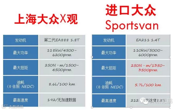 Sportsvan 动力方面只搭载了唯一动力选择是最新一代1.4T 的EA211发动机,对于原装德国进口大众的调教水平确实也不是盖的,为了最简单直观的给各位担心动力的看官一个解释,我们可以用上海大众X观来对比: