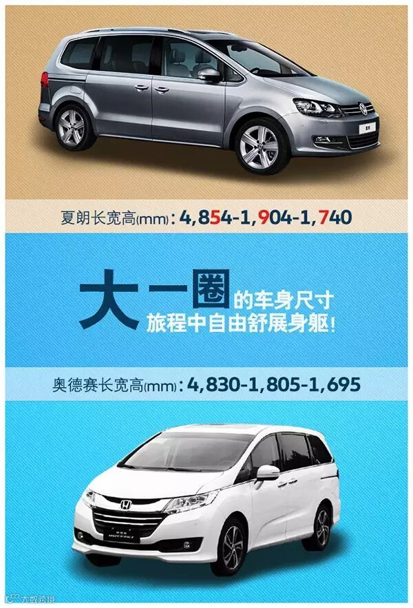 首先从造型上就能看出端倪。夏朗的车身尺寸是4854*1904*1740mm,数据上比奥德赛的4830*1805*1695mm要大上一圈。但是,夏朗是标准的两厢MPV造型,车头与车厢并没有刻意的去构成一个整体,A柱也没有过度前移,一副家用车的样子,看上去不像数据上显示的那么大,更不会让路人甲把开车的你误认为是司机,安全感和厚重感也更好。奥德赛是标准的日式MPV设计理念,A柱尽量前移,与引擎盖轮廓线构成一个整体,尽量缩短车头,加大车厢,实现空间最大化,中控台的纵深感也更好。不过就是有点单厢车的即视感,看上去给人一种大车的感觉,很容易让人联想到商用轻客或是面包车,视觉安全感也差点事儿,而你也更像是专职司机。SO,在造型设计上如果单纯从家用角度出发的话,显然夏朗会更加符合一家老小的审美需求。