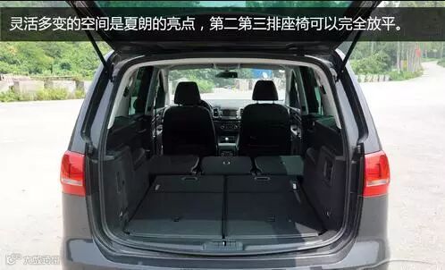 夏朗2+3+2的座椅布局在七座SUV以及欧系MPV中较为多见。这种布置更好的平衡了后备箱空间和乘坐空间。第三排座椅可以完全收纳,只需搬动座椅靠背外侧的锁扣即可,并形成一个纯平的后备箱空间,提供标准的五座空间和一个标准意义上的后备箱。如果需要运载大件物品时,第二排每个座椅靠背都可以独立放倒,形成一个与后备箱平齐的空间。同样的,副驾驶座椅靠背也可以完全折叠与后备箱平齐,靠背还有杯架来临时充当小桌板。多样化的空间布局也使得夏朗的后备箱实现了从300L到2430L的变化,有30多处储物空间,并具有运载超长物品的能力。不过有一点不足,虽然夏朗的内部空间可以做到座椅放倒后纯平,但是由此带来的问题在于无法提供低地板的设计,后备箱开口较高,身材不高的人取放大件物品时会略显不便。