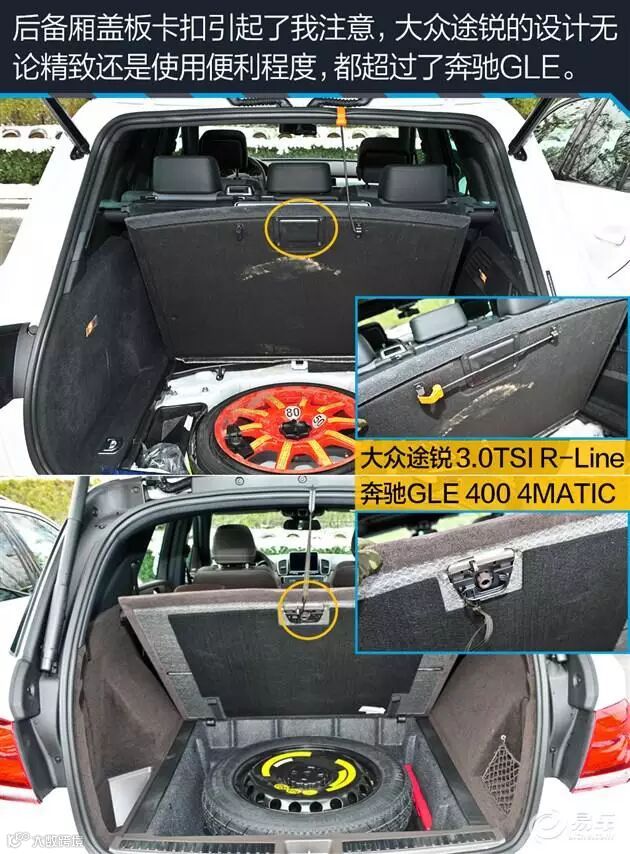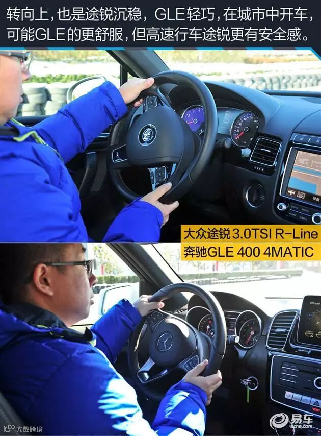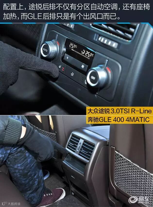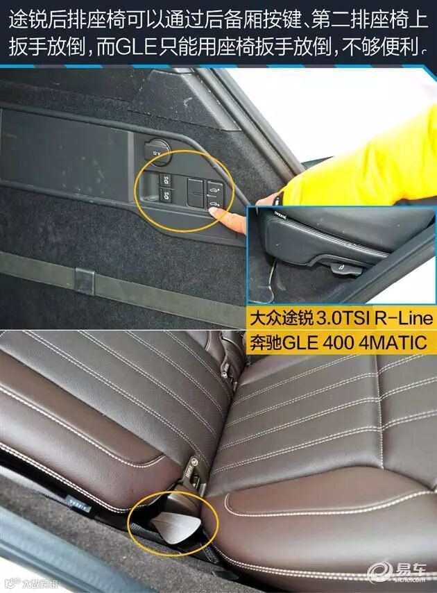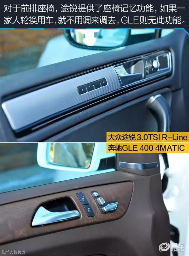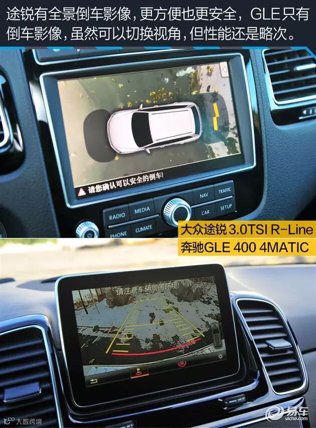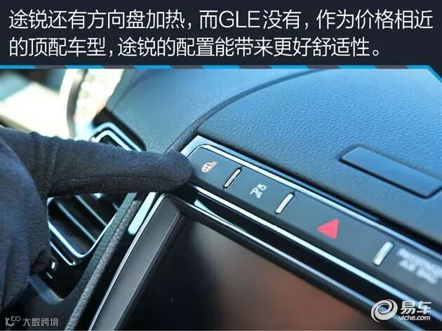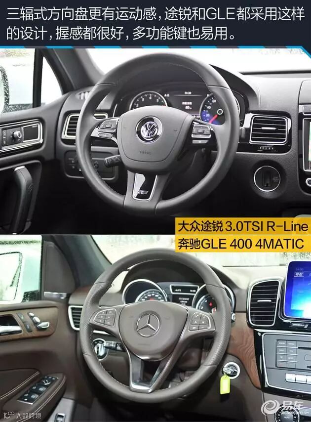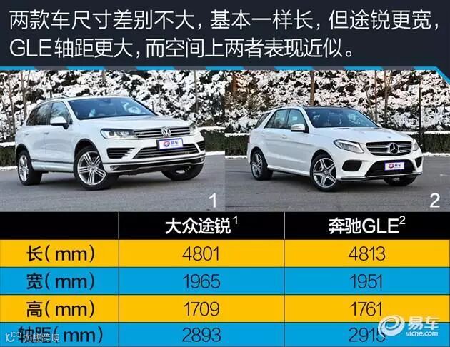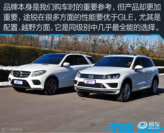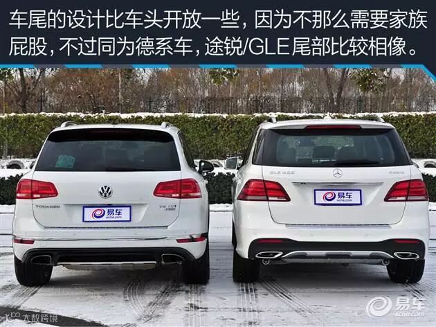 还有很重要的一点,在配置上,途锐基本每一项都比GLE好一些,比如GLE是手动调节方向盘,途锐是电动调节;GLE是普通倒车影像,途锐是全景倒车影像;GLE是普通音响,途锐是丹拿音响;GLE是前排座椅加热,途锐是后排座椅也有加热。作为豪华SUV,途锐的配置让人感觉更享受一些。