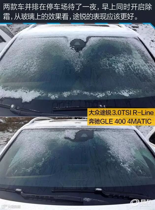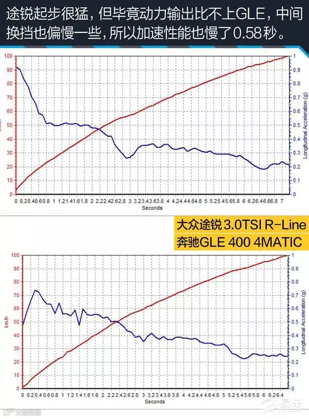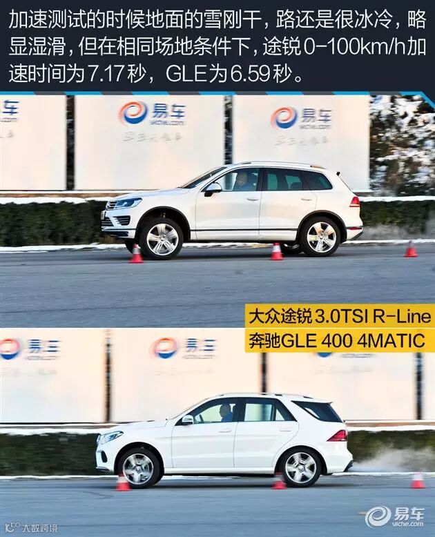 性能测试部分,奔驰GLE 400加速比大众途锐3.0TSI快一些,成绩分别为6.59秒和7.17秒。当然由于测试地面温度太低,而且刚下完雪没有完全干透,所以这都不是两款车最快的加速成绩。不过在相同测试条件下,这样的成绩依然证明了两款车的性能差异。奔驰GLE400的确要更快,途锐3.0TSI也比较快。