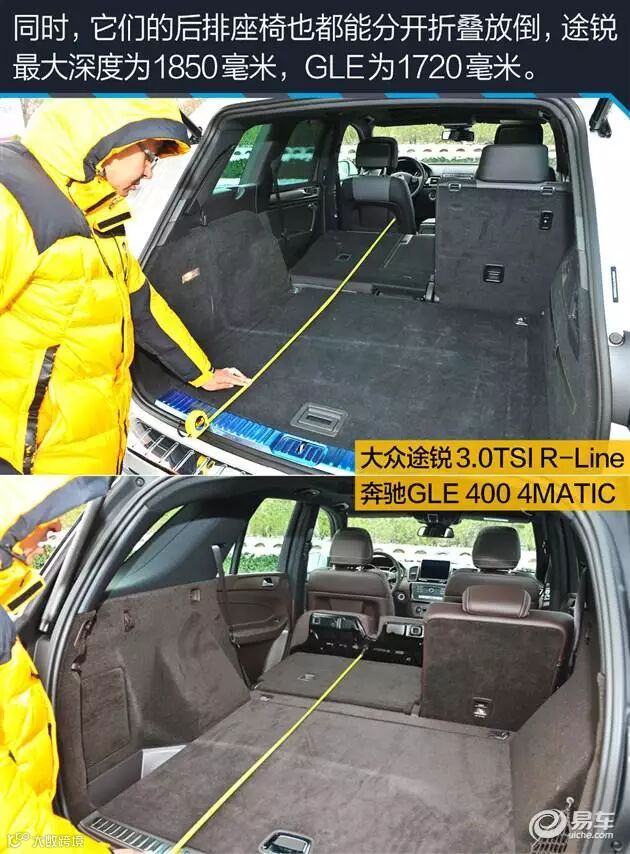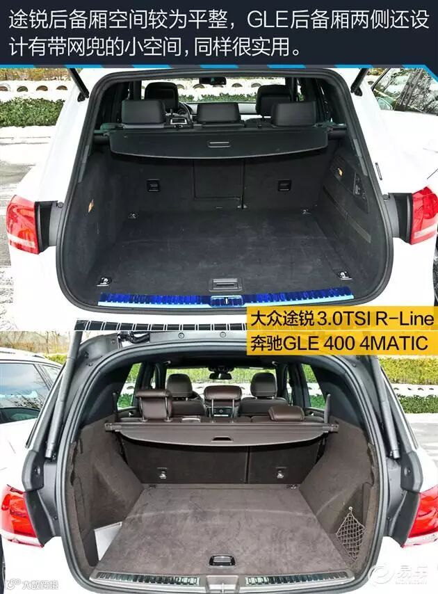 后备厢部分,途锐后排座椅靠背可调,并能向前推进,使后备厢容积从580升增加到679升。如果将后排座椅折叠起来,容积可以扩展到1620升。GLE后备厢同样很实用。