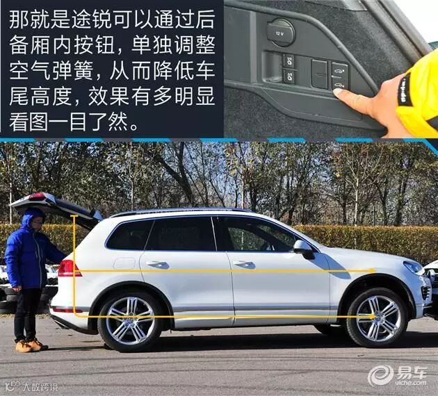 不过途锐还有一项细节令人感觉更强大的功能,就是可以通过调整空气弹簧,单独降低后备厢开口高度。虽然国内用车情境没有什么使用这些配置的机会,但如果有用,一定能让旁观者倍感震撼。