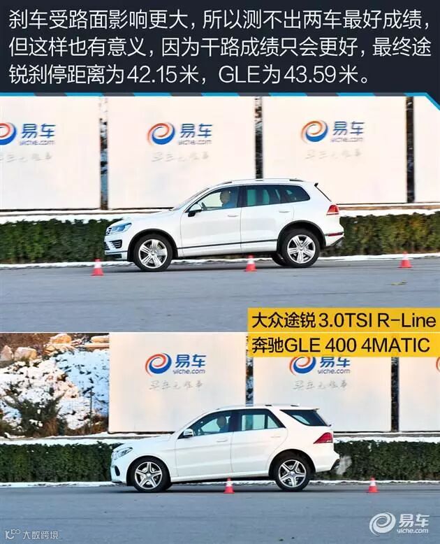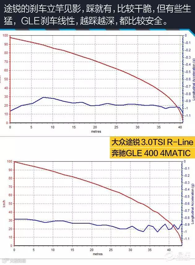 在刹车测试中,由于地面没有完全干透,而且轮胎温度太低,有些滑,测试条件受天气影响较多,所以成绩都不算理想。比较来看,同样100km/h时速到完全停止,大众途锐3.0TSI需要42.15米,奔驰GLE 400需要43.59米。两者成绩处于同一水平,但就和加速测试一样,如果要分个高下,那么途锐的制动性能相比之下也更好一些。