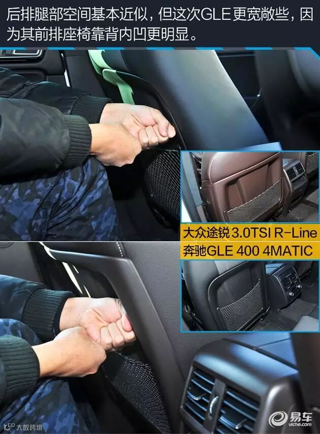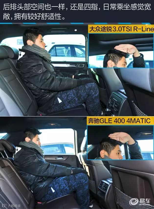 大众途锐和奔驰GLE车长近似,都是四米八多一点,但GLE轴距更长一些,多出22毫米,途锐则更宽一些,多出14毫米。不过从空间体验上看,两者比较接近。但是由于GLE前排座椅靠背内凹更明显,所以给人感觉腿部更宽敞些。