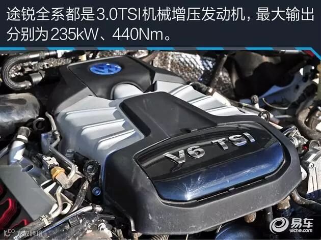 大众途锐全系都采用3.0T发动机,不过不是常见的涡轮增压,而是机械增压。最大功率235kW、最大扭矩440Nm,搭配8挡手自一体变速器。