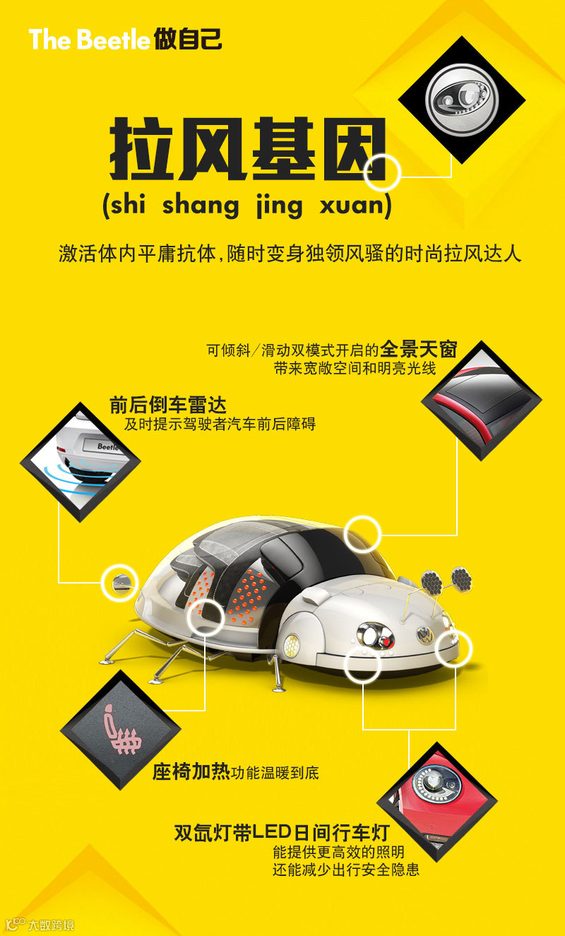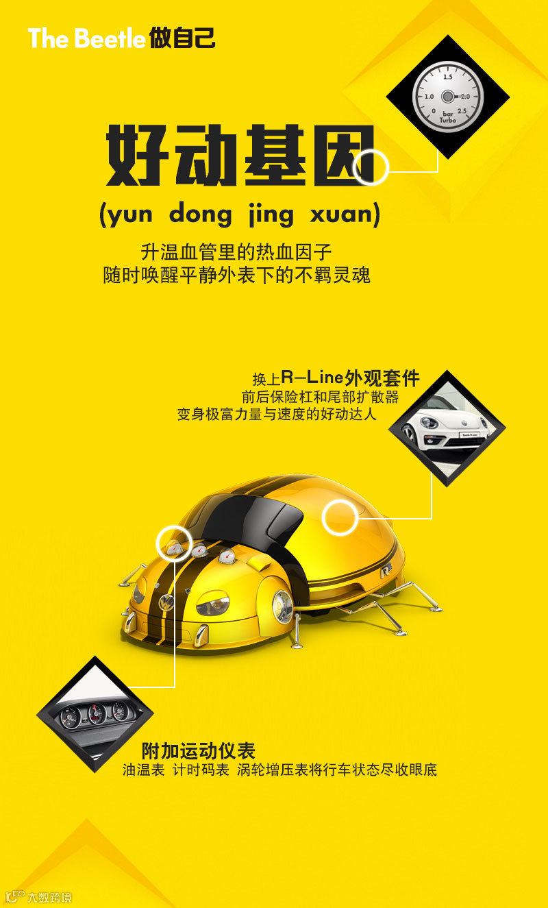 R-Line外观套件: 包括运动风格的前后保险杠和尾部扩散器,为甲壳虫披上极富力量与速度格调的外衣。