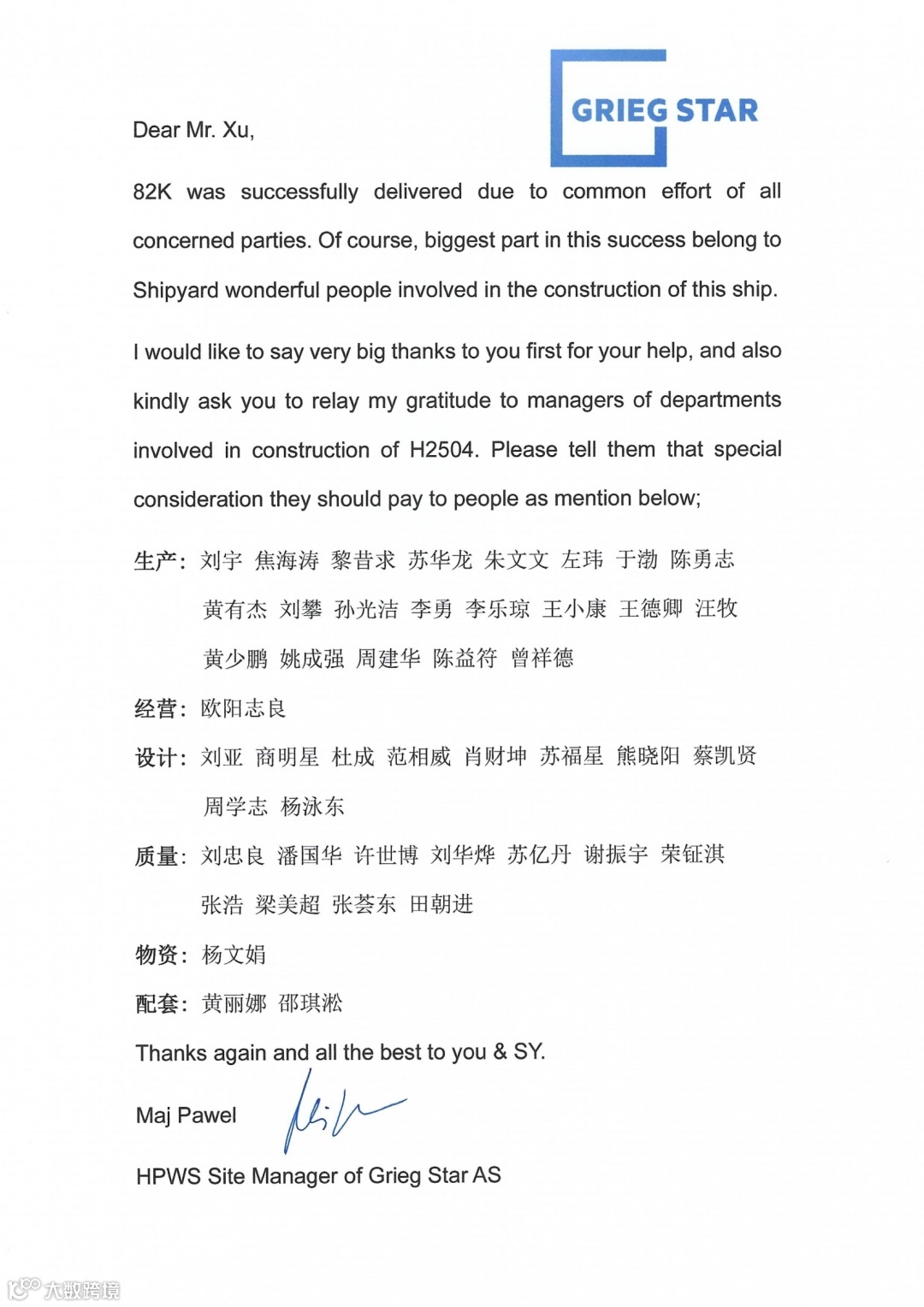 近日,我司收到来自欧洲知名船东公司 Grieg Maritime Group 监造经理 Mr Pawel 的感谢信。信中,Mr Pawel 对黄埔文冲在 82300MPV 项目首制船的建造过程中展现的高效管理、卓越组织能力及积极的响应态度给予了高度的肯定,更对交付的船舶可靠品质表达了由衷的赞赏和敬意。这封满载赞誉的信件,不仅是对黄埔文冲建造能力的认可,更标志双方合作高效成功。