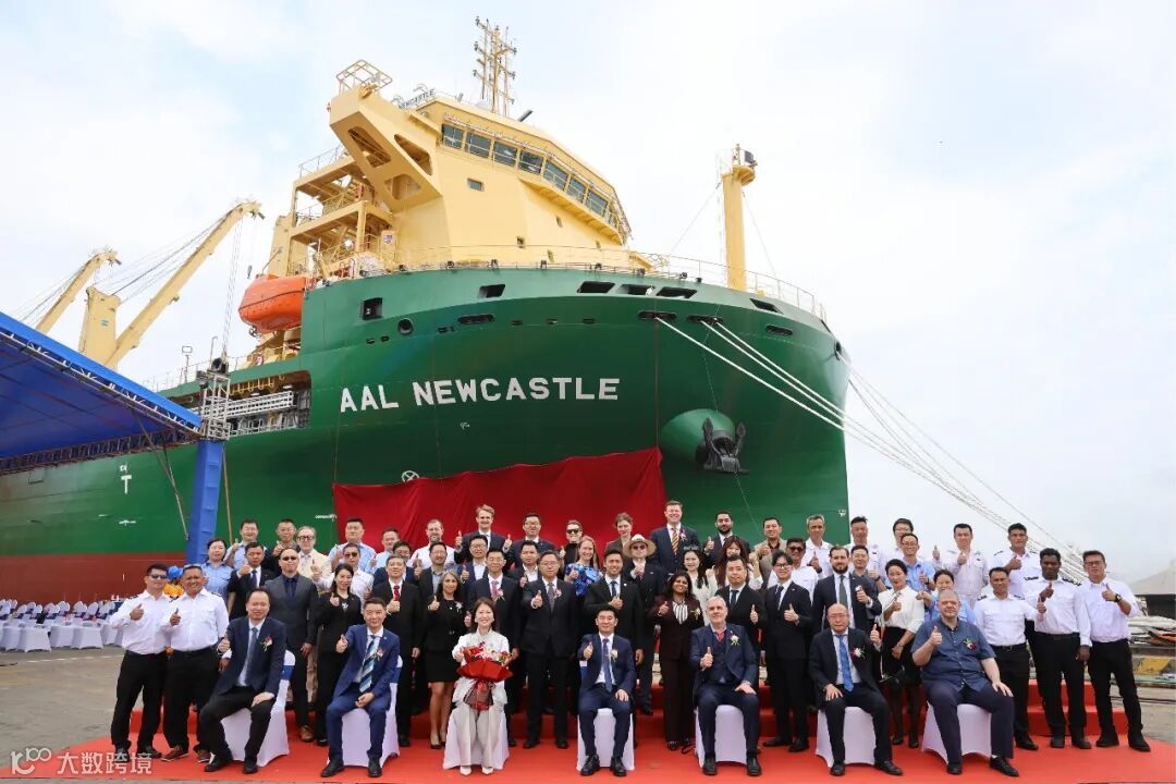 在龙穴厂区举行的命名交付仪式上,黄埔文冲与Schoeller Holdings、AAL Shipping、CSM、船级社及中船贸易代表,共同见证了“AAL NEWCASTLE” 轮顺利交付。