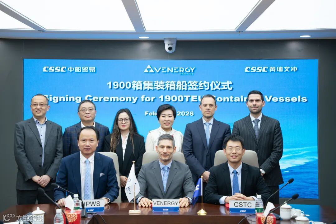 此前,三方已于2025年12月签署首批2艘“鸿鹄”型1900TEU支线集装箱船订单,此次签约正式确认该订单中另外2艘选择船生效。签约仪式上,Venergy Maritime Limited、黄埔文冲及中船贸易三方代表共同见证了这一深化合作的时刻。