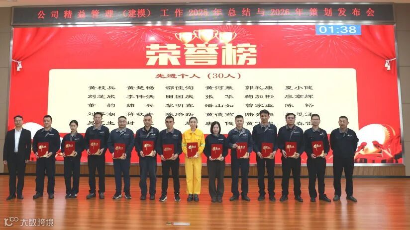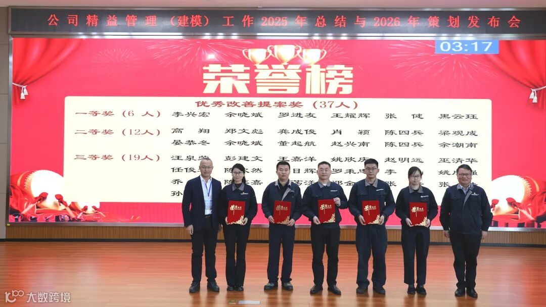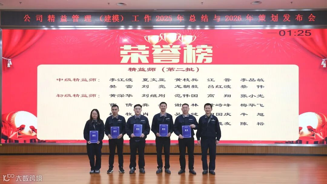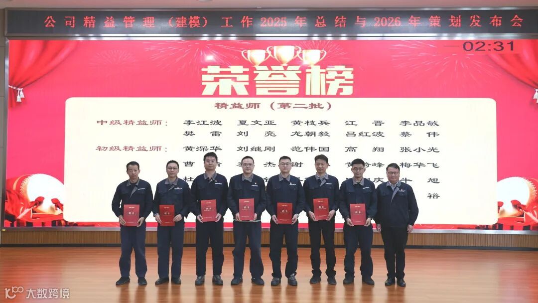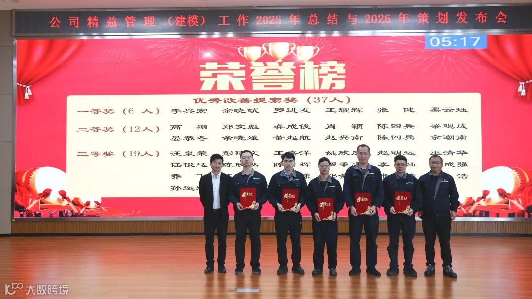 会上,各项目负责人依次汇报8个精益管理A级项目情况,精益专家根据项目成效展开现场评比。表彰环节中,公司对2025年下半年优秀改善提案、精益先进个人及集体进行颁奖,并为新晋精益师颁发证书。