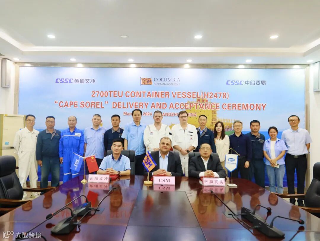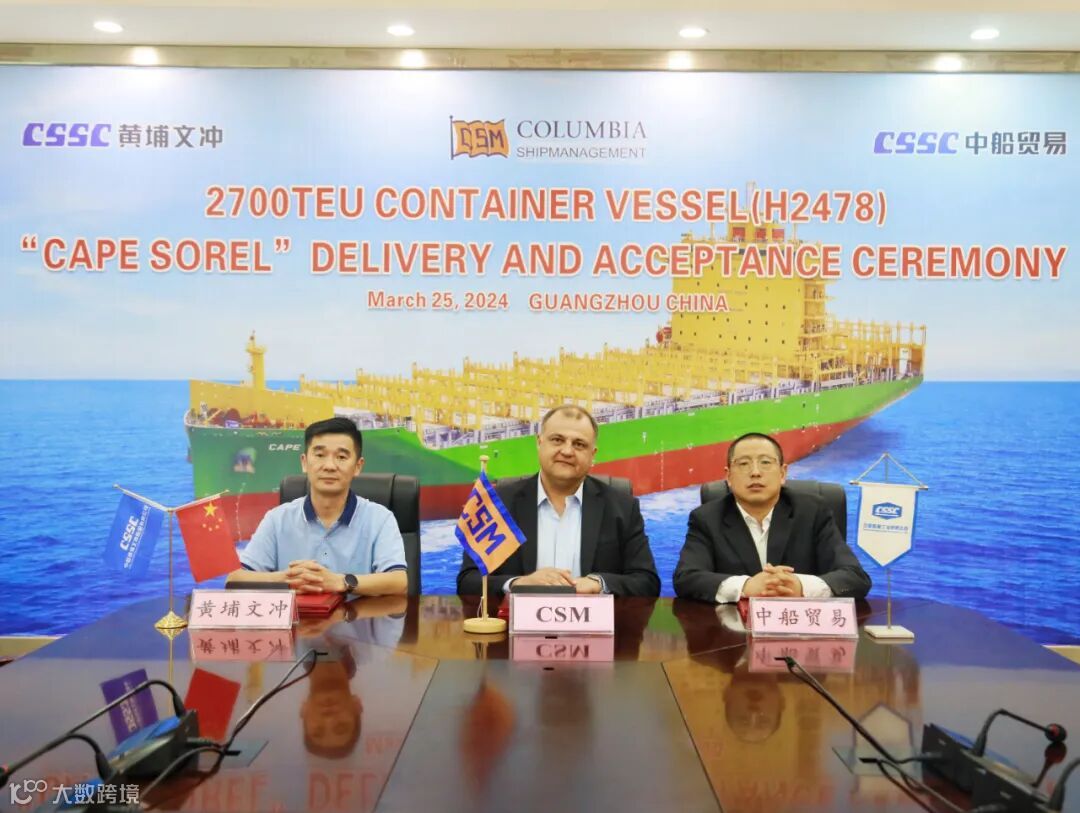 2024年3月25日,中国船舶集团下属黄埔文冲公司在龙穴厂区举行“CAPE SOREL”轮(H2478)交船仪式,较合同期提前128天交付。