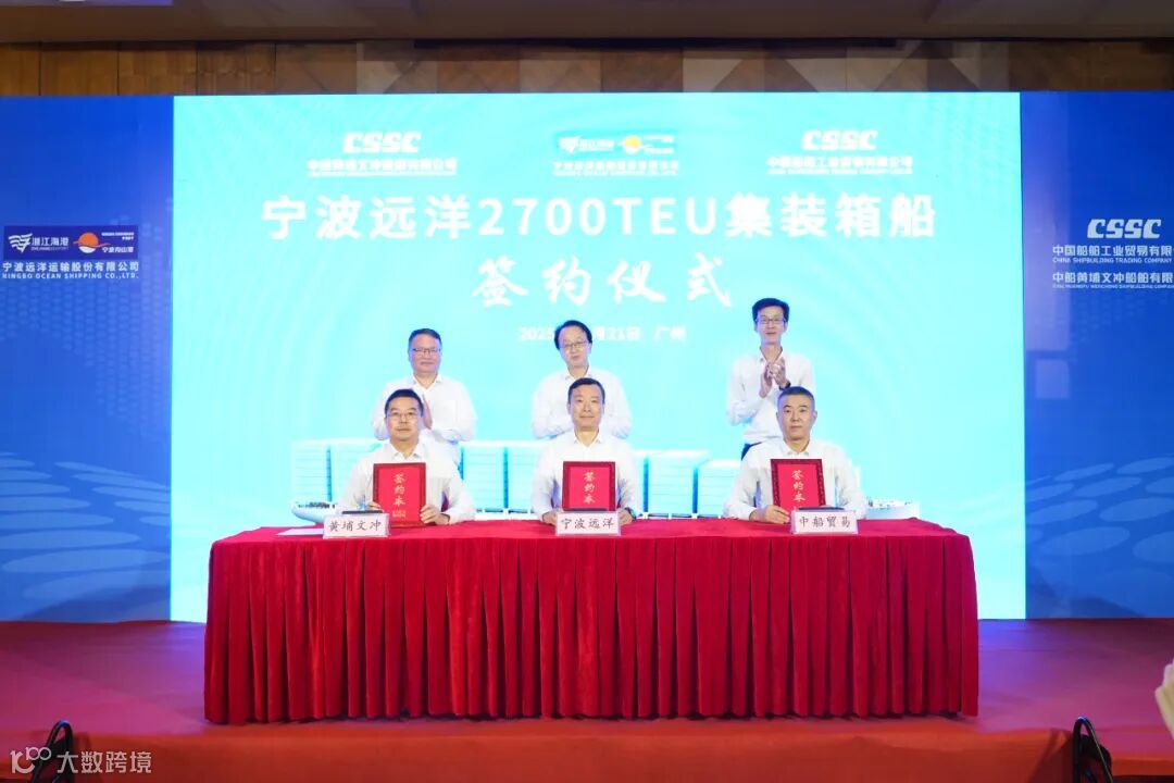 2025年10月21日,中船集团旗下中船黄埔文冲船舶有限公司联合中国船舶工业贸易有限公司与宁波远洋运输股份有限公司正式签署4艘2700TEU集装箱船的建造合同。浙江省海港集团、宁波舟山港集团党委书记、董事长陶成波,宁波远洋党委书记、董事长陈晓峰,中船黄埔文冲党委书记、董事长罗兵出席仪式。