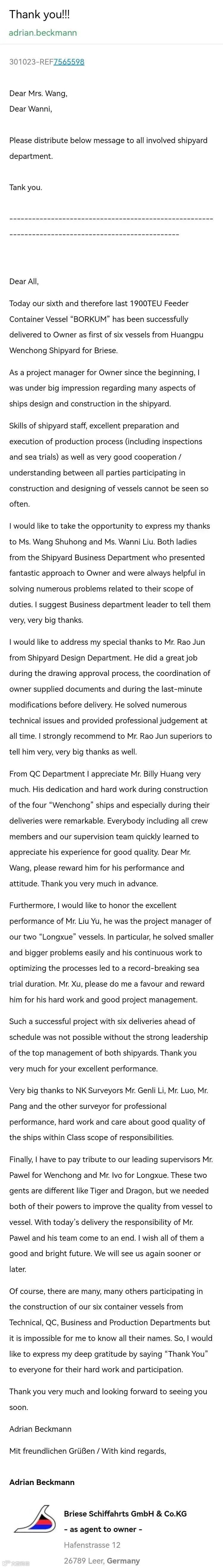 近日,公司收到来自德国BRIESE公司的感谢信。