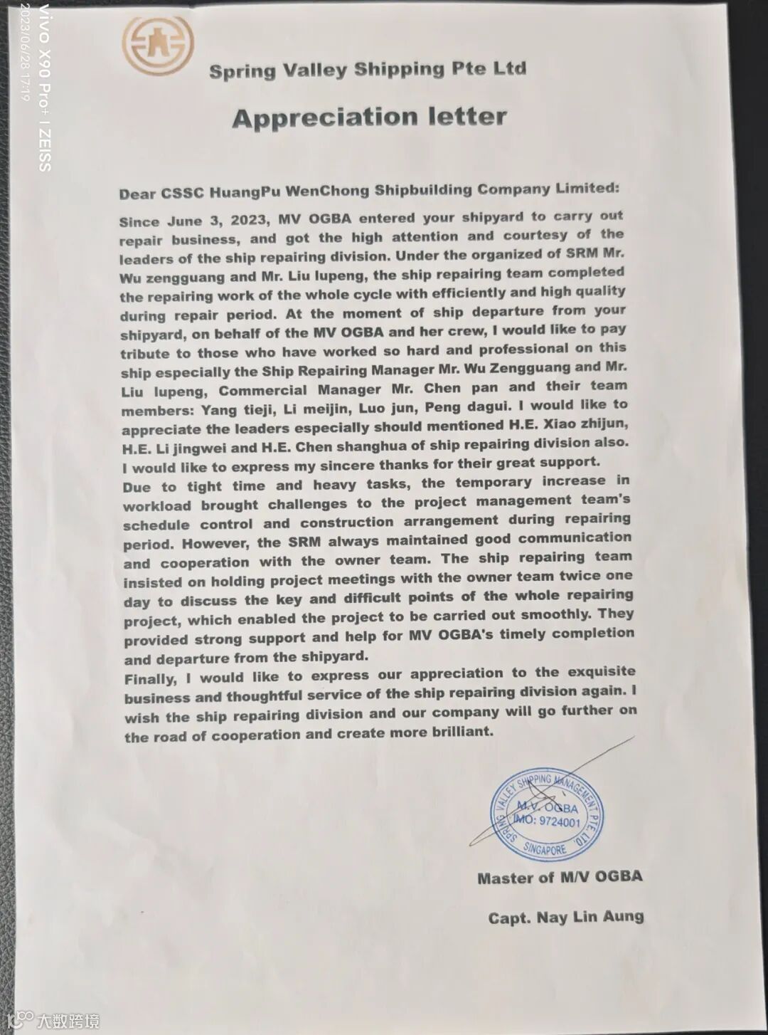 近日,由中国船舶集团旗下黄埔文冲公司修船事业部承修的新加坡籍外轮“德罗巴”圆满完成修理任务。该项任务历时近一月,6月23日,修理完成后的船舶离厂启航,项目组收到来自船东的感谢信。