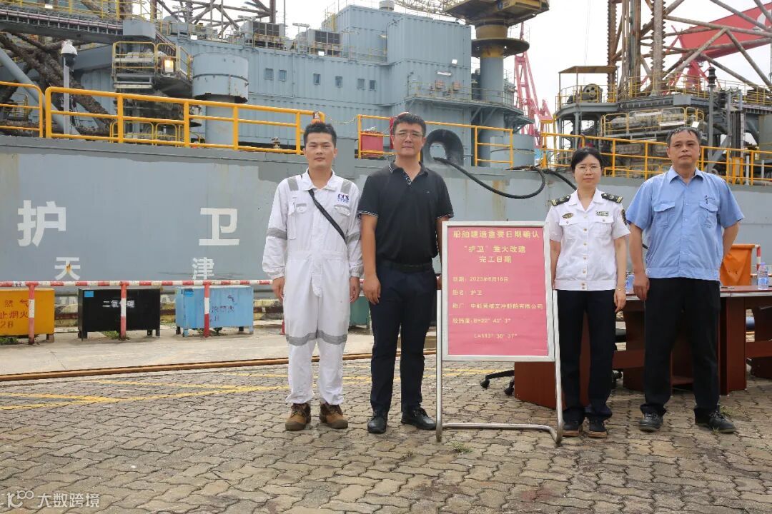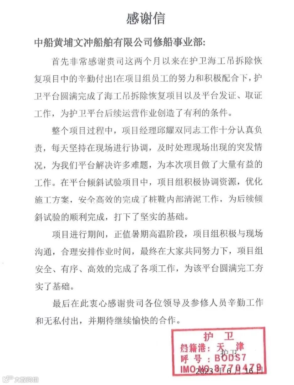 2023年以来,黄埔文冲公司持续推进海洋平台修理,继“精铟01”平台完工后,“护卫”海洋平台于6月15日,顺利开展完工四方见证并签署船舶建造重要日期完工确认书,并收到船东感谢信。