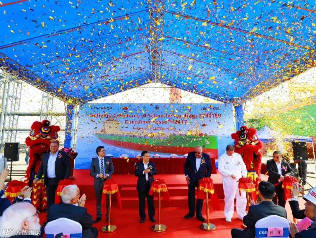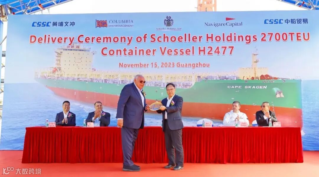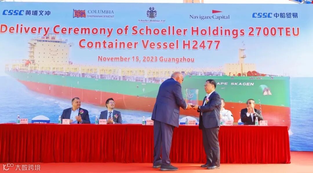 2023年11月15日,中国船舶集团旗下中船黄埔文冲船舶有限公司为Schoeller Holdings公司批量建造的2700TEU系列集装箱船3#船(H2477)顺利交付,该船命名为“CAPE SKAGEN”轮,较合同期提早15天。