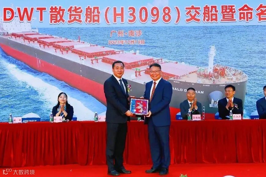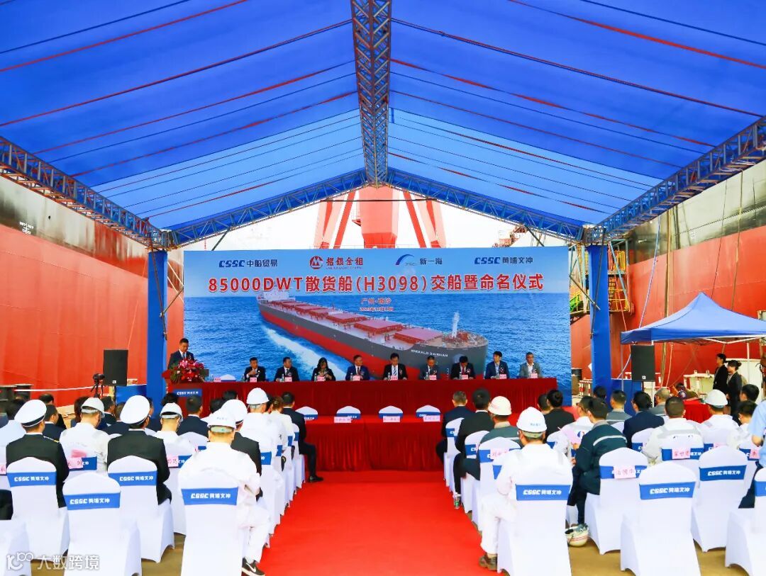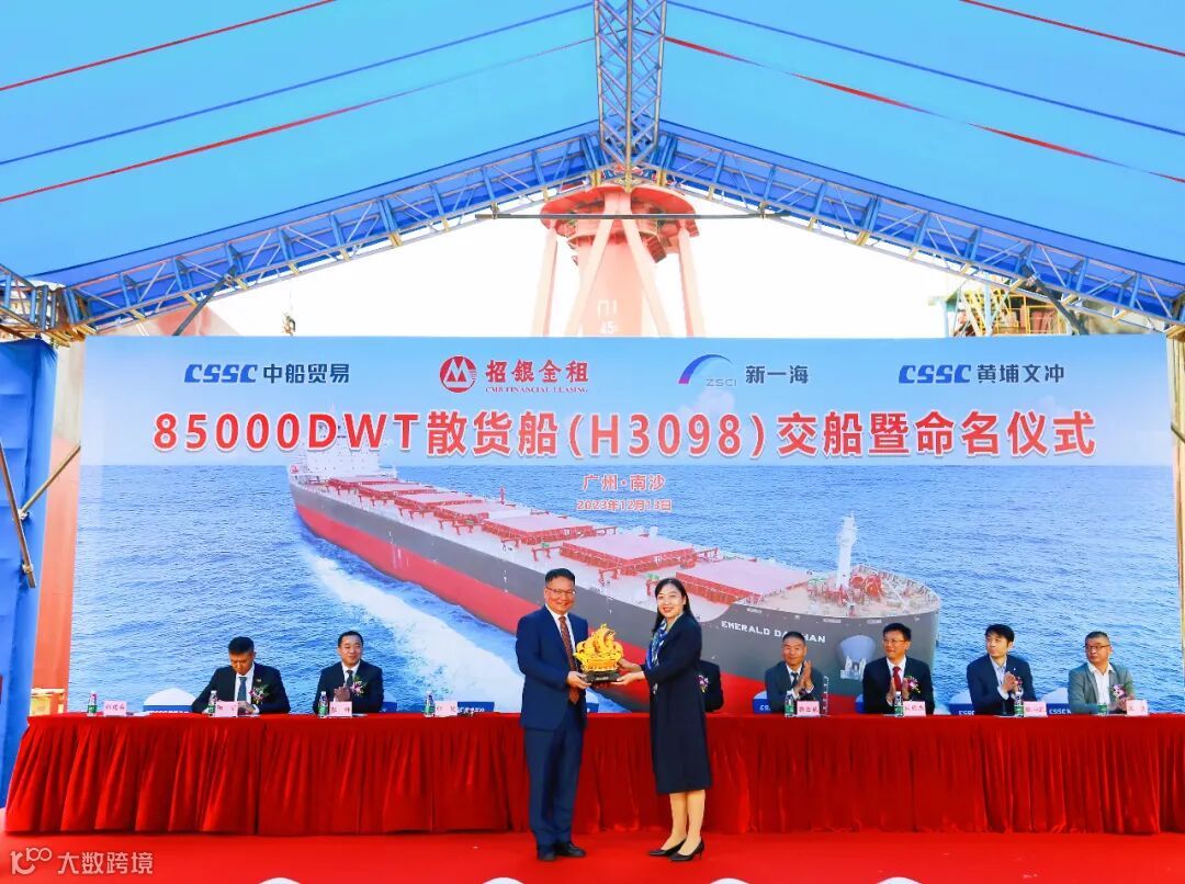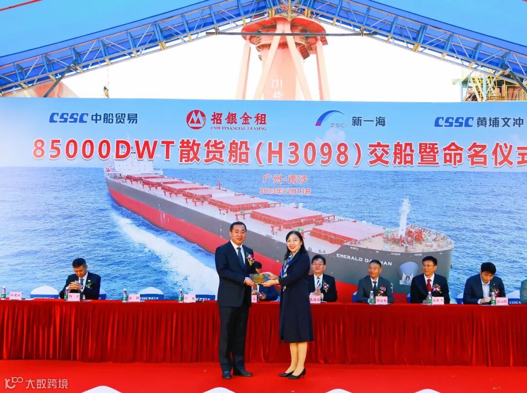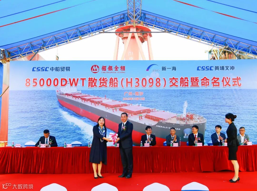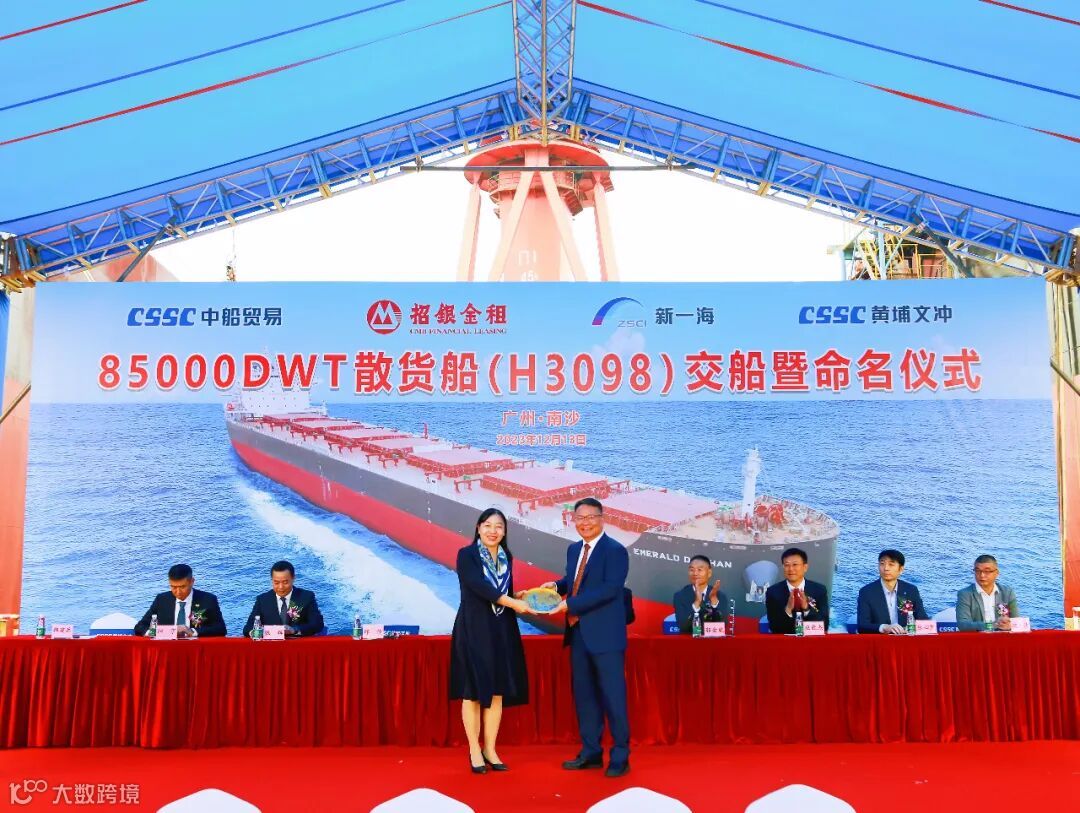 2023年12月13日,中国船舶集团旗下黄埔文冲公司在龙穴厂区举行“EMERALD DAISHAN”轮(H3098)交船仪式,较合同期提早1个月。