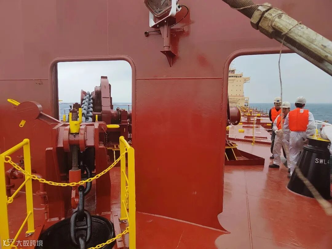 出海后海况开始变得越发不稳定,开展深水抛锚试验前,指挥部调整好报验计划为清晨第一时间开始报验。由于当时风浪不断拍打船身,船舶横摇晃动加剧,试航指挥部在船长的密切配合下,适当调整主机车钟速度以稳定船身,给首部抛锚人员尽量创造更为稳定的船舶状态。通过不懈的努力,经过近2个小时的深水抛锚顺利完成。