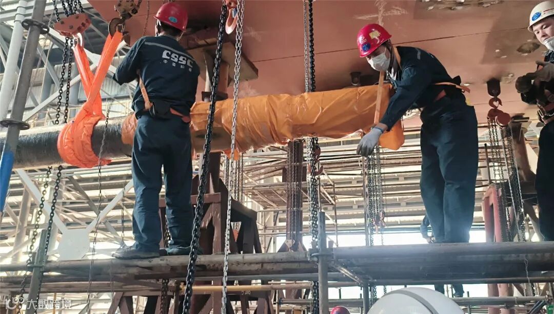 “中国渔政44002”的轴系长度为28米,且轴系倾斜角度达3度。由于过长,该船轴系具有挠性,安装过程中会下垂,这就需要不断调整进轴角度。承担这项任务的机装作业人员用手拉葫芦不断调整轴系位置,一点一点地移动受力点,慢慢地找平衡,精神高度集中。这样高强度的工作对于施工人员是极高的挑战,在火热的造船现场,一天连续工作5个小时,汗水让他们从头到脚都湿透了。但他们咬住牙关,用整整两天的时间收服了“拦路虎”。