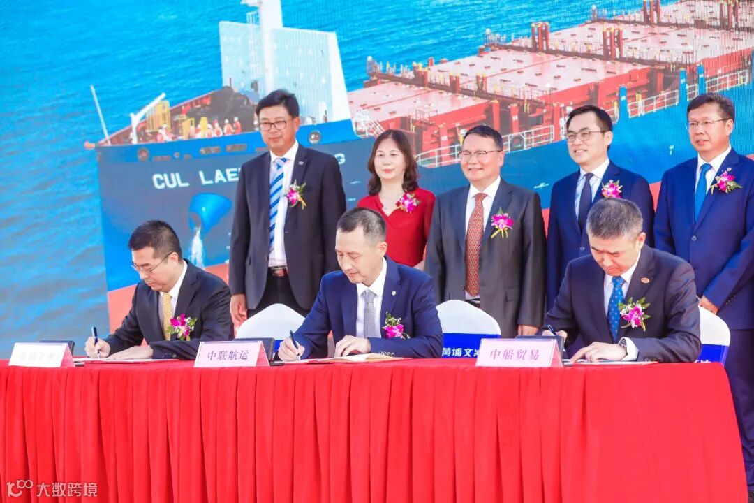 黄埔文冲公司总经理助理韩建兵、中联航运船舶管理部总经理谌学东、中船贸易船海业务一部总经理阳宇代表三方在交船文本签字。