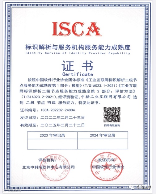 近期,经中国软件行业协会指导开展、中科院软件中心评测验证的工业互联网标识解析与服务能力成熟度等级评估,中船黄埔文冲船舶有限公司属下中船工业互联网有限公司(简称中船互联)在团体标准《工业互联网标识解析二级节点服务能力成熟度第1部分:模型》(T/SIA023.1-2021)及《工业互联网标识解析二级节点服务能力成熟度第2部分:评估方法》(T/SIA023.2-2021)方面,经测评验证,达到二级节点四级服务能力(目前国内最高级),成为首批标识解析等级评估获证企业。