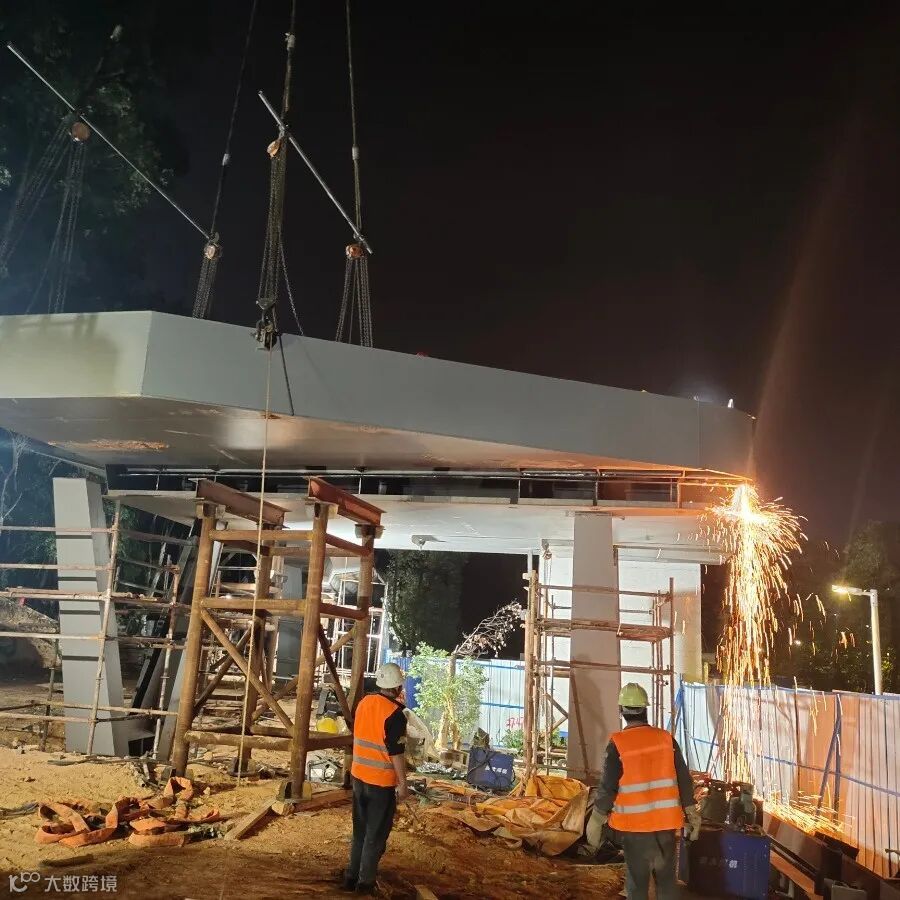 东莞立体慢行系统3A桥分为A、B、C三条轴线,A线北向连接黄旗广场,向南通往东莞国际金融大厦。A线全长308米、B线全长177.026 米、C线长 31米,主体结构共846吨。该项目从9月下旬开工到现场52个分段吊全部装完,历时2个多月的时间。
