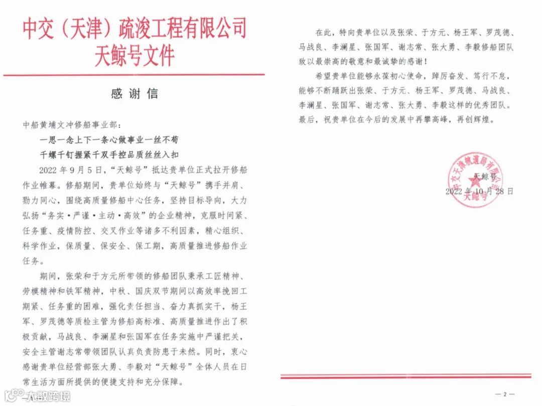 公司修船事业部收到了中交(天津)疏浚工程有限公司天鲸号发来的感谢信。