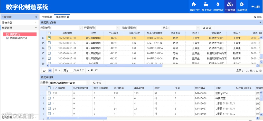 一个是在公司数字化制造系统下开发的“托盘管理模块”,主要功能是采集设计源头数据、快速收图、分交、下单委外制作、托盘集配、托盘预约和实托配送确认、综合数据查询、分析等功能。
