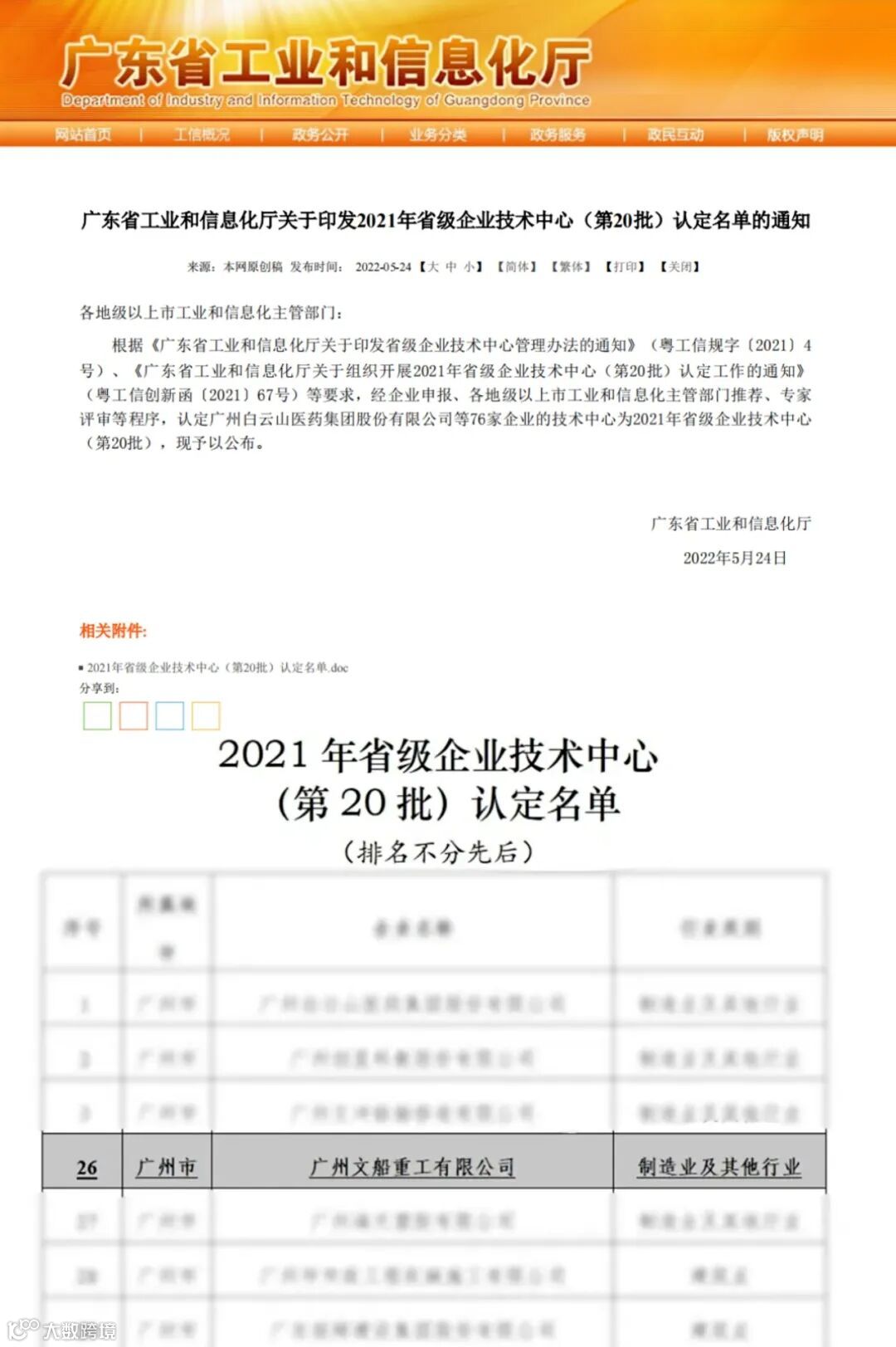 5月24日,中船黄埔文冲船舶有限公司(简称:黄埔文冲)下属文船重工公司顺利通过广东省工业和信息化厅开展的第20批省级企业技术中心的认定。