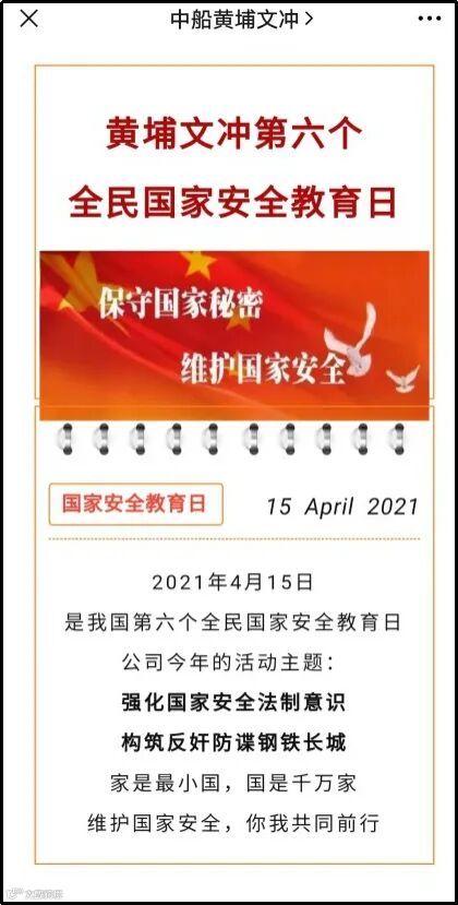2021年4月15日,是我国第六个“全民国家安全教育日”。在此期间,黄埔文冲精心策划,紧扣大局,紧贴实际,开展了以“强化国家安全法制意识,构筑反奸防谍钢铁长城”为主题的宣教活动。