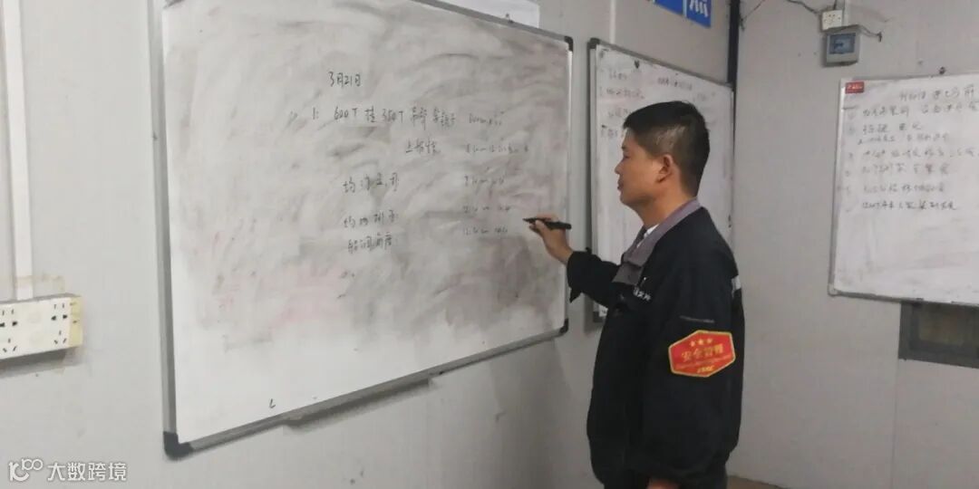 H6018船进坞,表面上看是常规的吊装作业,实际涉及的协调面之广,协调工序之复杂,是很多人想象不到的。除了协调日常的厂区搭涂部、总装部、生产保障部、安环部、物资部、质量部等各部门外,还要涉及船东船检的夜班报验,振华吊机厂家、运输船长、设计院、引水拖轮等各相关方的工作工序都要统筹协调。吊车安装后船舶压载状态的调整、桩腿接桩固桩室强度的计算、吊车运输船进出坞时间衔接、坞门关闭及坞内水位的调整、船舶坞内角度调整、吊装工艺要求的逻辑关系以及船上350多人作业的保障……可以说每一步工序都紧紧相扣,每一个指令都涉及到公司的安全、成本、生产进度;坞期紧、任务重,面对如此复杂的局面,与往常一样,他又把被子、简单洗漱用品带到了现场指挥部,坐镇现场,开启一场没有硝烟的“战争”。