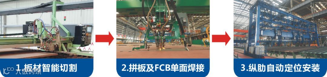 块体制作流水线的FCB工位,用于钢壳块板材拼接工作,采用3电级埋弧焊法,工艺数据库最大满足99项焊接条件的预设,具有焊接管理及诊断功能,一改传统拼板翻身的低效局面,采用大线能量FCB高速焊接,单面焊双面一次成型,减少钢板翻身时间,提高了电弧的利用率,大幅度提高了焊接效率,质量稳定可靠,可谓钢壳拼板之“利器”。