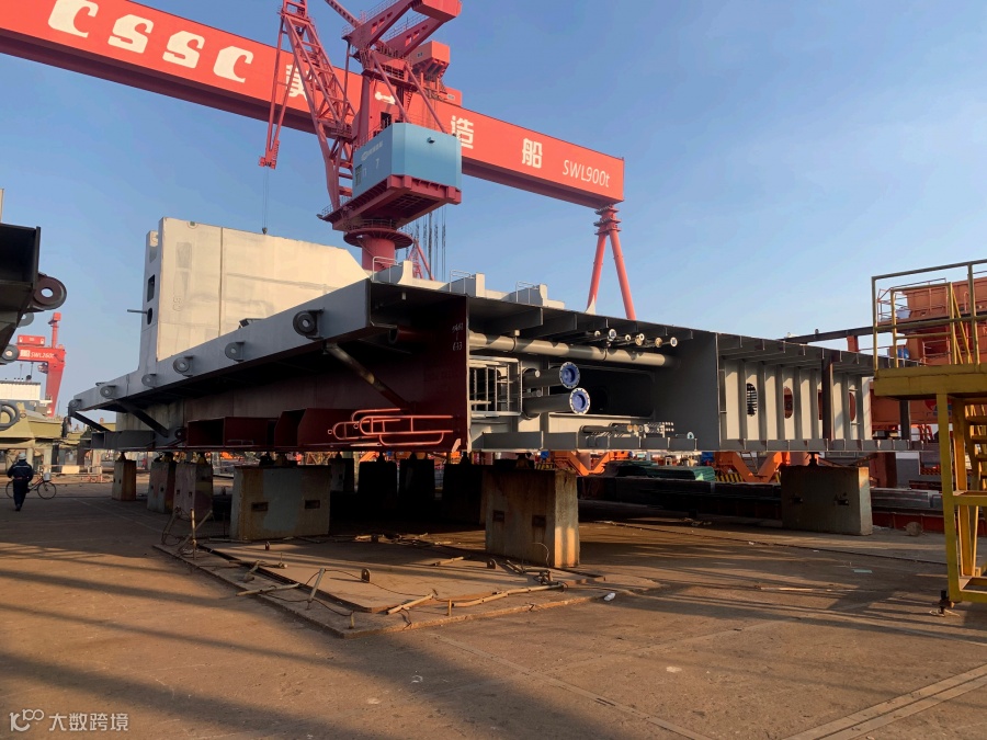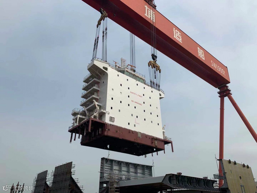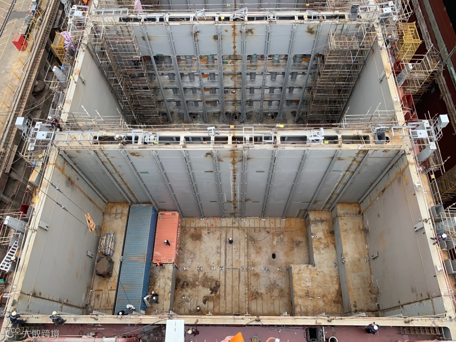 该船进坞前29个总段全部总组完,整体吊装。尾部段于2021年1月9日开始在坞内连续搭载,5天机舱成型,1月30日照光报验完,22天完成轴舵系安装工作。