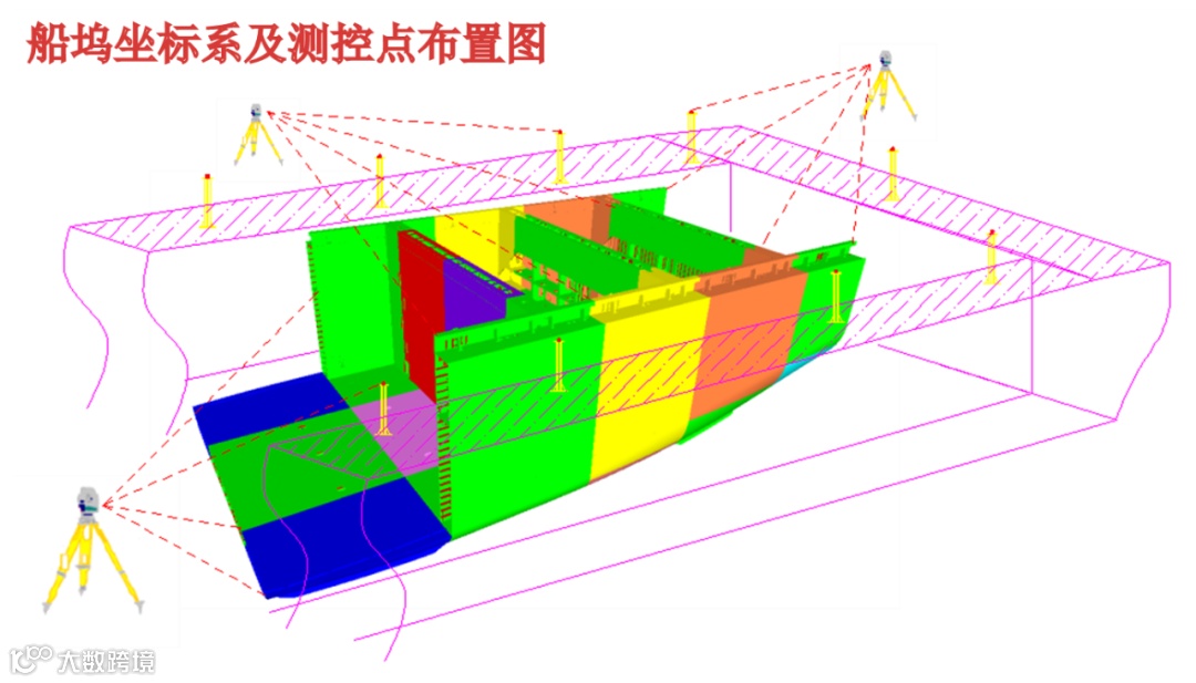 这就相当于给船坞安装上了三维刻度尺,可以随时采集船坞内分(总)段的三维坐标,通过与预设坐标点的对比,从而实现快速定位,像搭乐高那样用分段搭载成船舶。