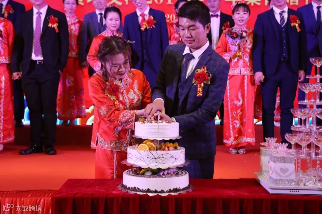 刘志康、袁凡凡夫妇代表新人切蛋糕。