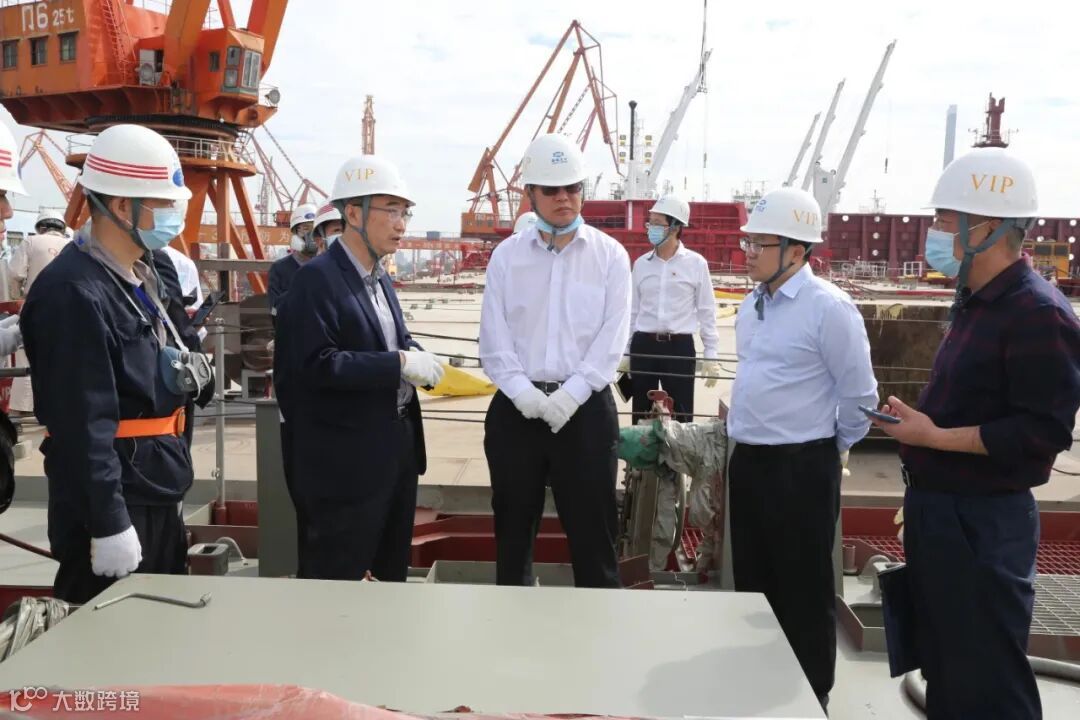 调研期间,覃伟中一行深入生产现场,登船视察1400TEU船生产建造情况,详细了解了公司生产建造能力及该船总体运行情况,并询问了该船的相关技术指标和环保指标。