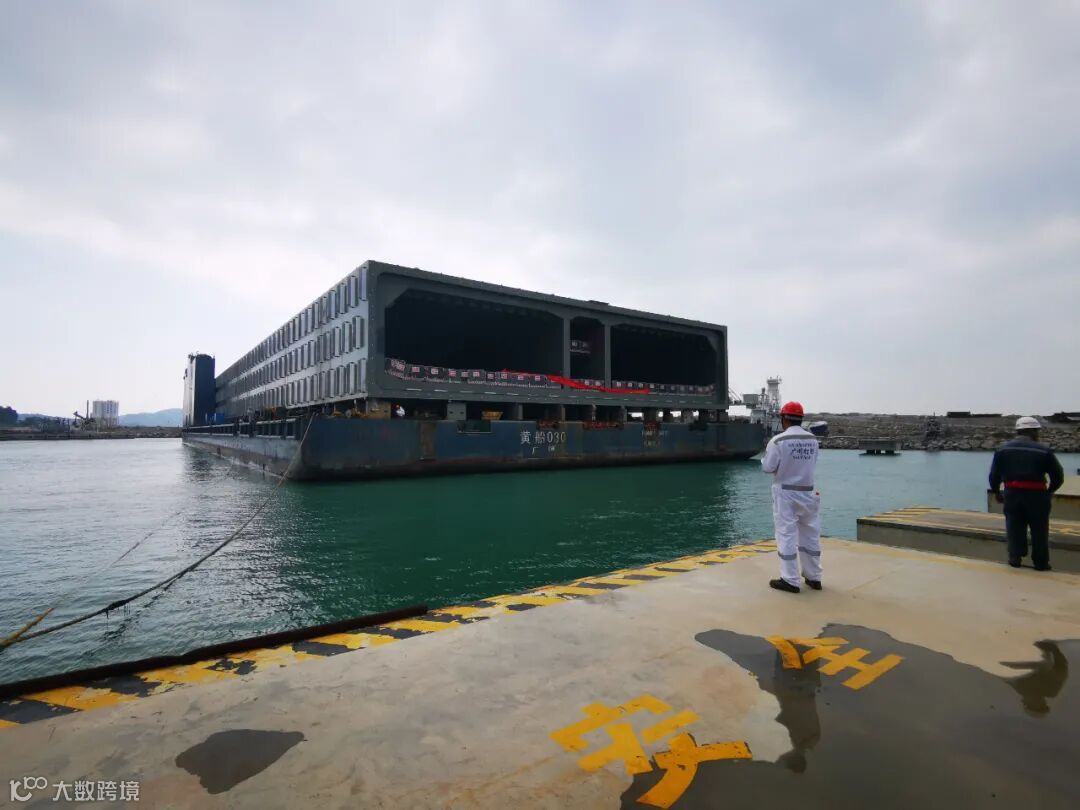 11月5日上午,E8管节顺利抵达位于伶仃洋上的桂山岛预制场,靠码头作业;在各参建单位的配合、支持下,当日下午1点开始上岸,下午4时落墩完成,整个上岸、落墩时间较前一个管节E6缩短了一个小时。