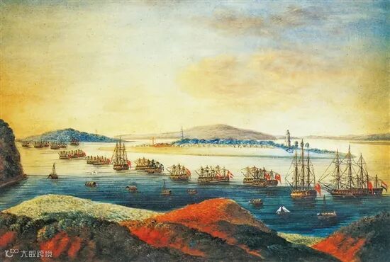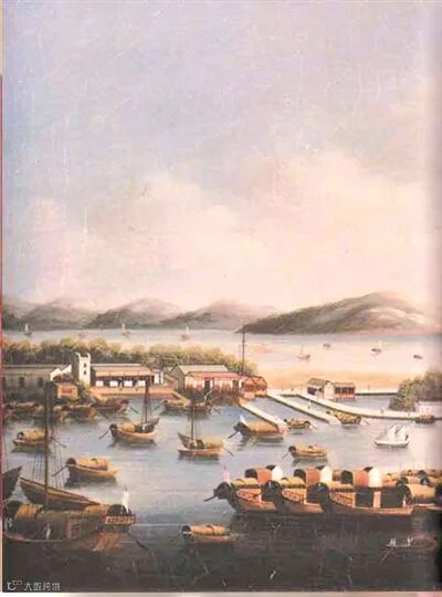 <19世纪初黄埔水道油画,近处为长洲岛柯拜船坞一带>