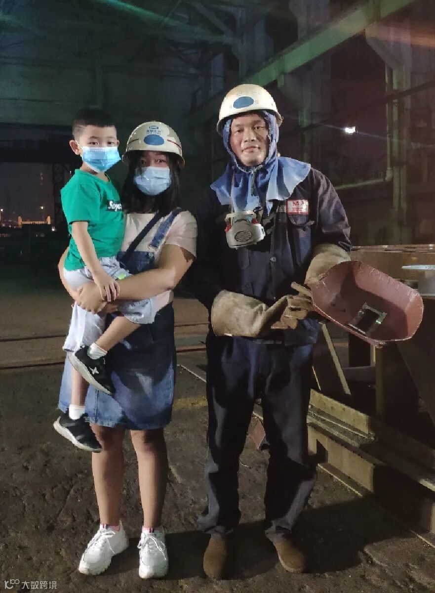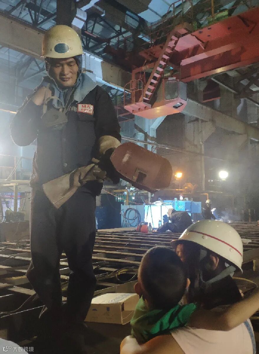 重工公司海洋工程部昌成泰李队装焊三班的船体装配工李康也在加班加点,他的妻子带着两岁多的孩子来看他。在妻子的心中,李康不太爱说话,哪怕上半年项目忙碌的时候经常加班到深夜才回家,他也没在家人面前抱怨一句。