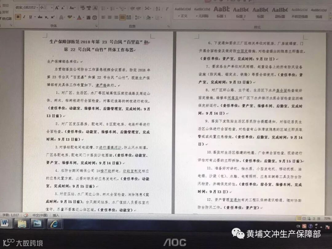 生产保障部先后三次召开防御台风“百里嘉”和台风“山竹”的工作布置会,落实对厂区、生活区、水厂等区域高低压架空线路及树木进行全面检查,对厂区变压器房、配电间、8区配电房、电线杆等进行全面检查,对临近居民生活区山体进行全面检查等等,开展隐患排查工作具体布置。