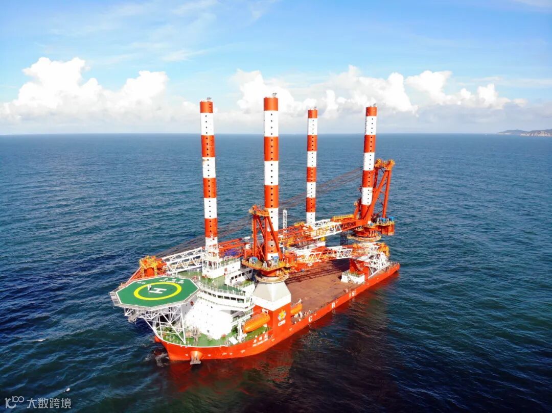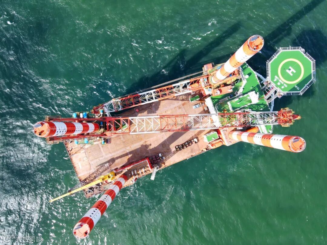 该船四条笔直修长的大长腿高90米,配有4套液压插销式双动环梁升降系统和冲桩系统,单桩最大举升能力5600吨。“华祥龙”依靠自身DP2在海上精准定位后,就能靠桩腿牢牢站立在海上作业点,作业水深(包括潮差)可达50米。与常规工程船相比,不仅节省撤场避风来回调遣和定位所需时间,而且可适用于浮式船舶无法作业的恶劣海域。