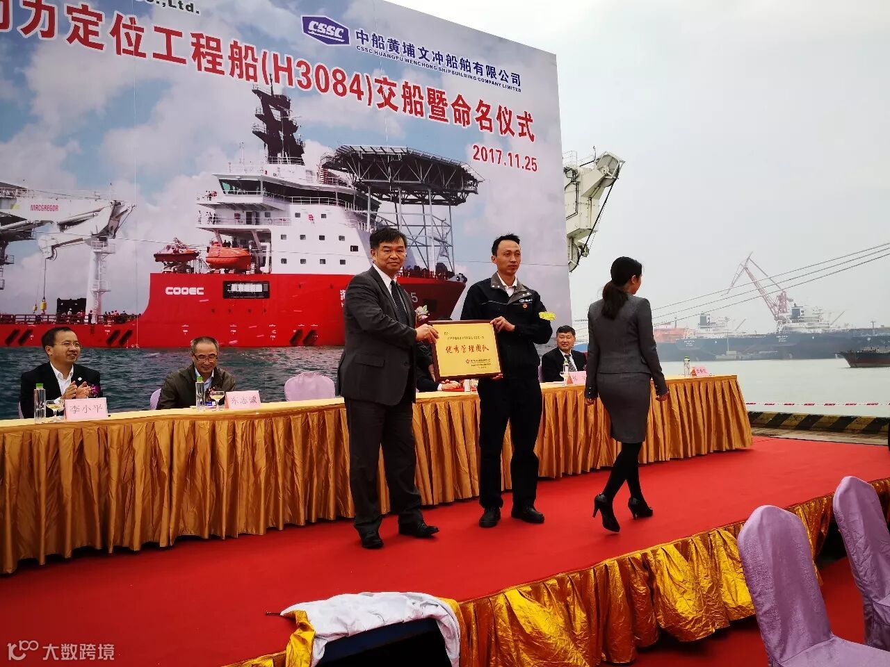 交船仪式上,船东授予海工总装一部优秀管理团队奖,海油工程总裁金晓剑为总装一部部长郑登勇颁奖。