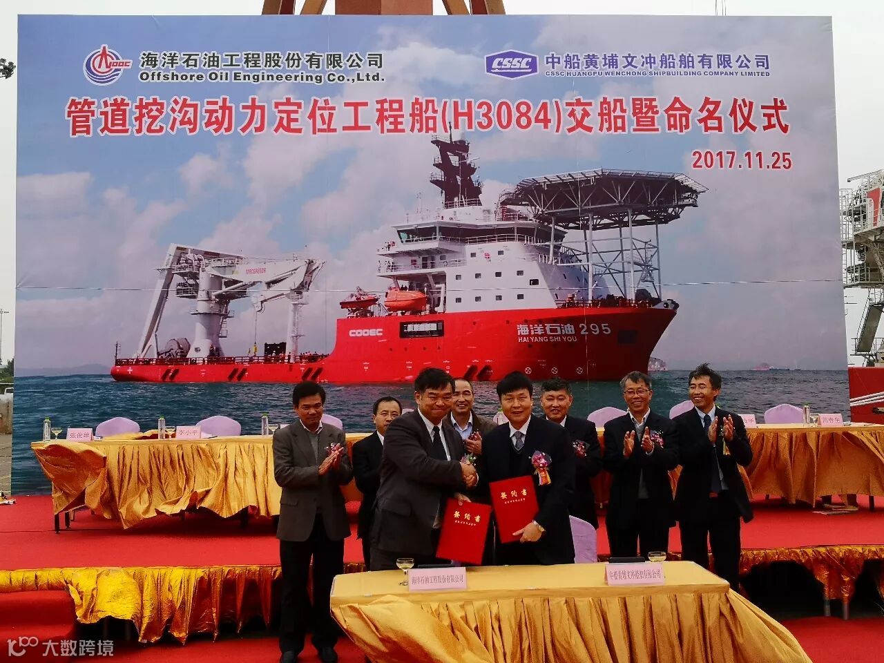 11月25日,中船黄埔文冲船舶有限公司为中国海洋石油股份有限公司建造的管道挖沟动力定位工程船“海洋石油295”船在公司龙穴厂区举行交船仪式。海油工程总裁金晓剑、黄埔文冲公司董事长陈忠前等领导出席仪式。