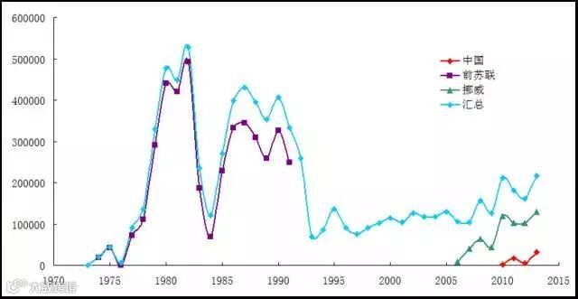 目前绝大多数磷虾产自位于大西洋南极部的FAO48渔区,即靠近阿根廷的Scotia(斯科舍)海域, 产量占了整个南极磷虾产量的90%以上。该区探明磷虾资源量约4429万吨,CCAMLR(南极海洋生物资源养护公约)针对此区域的限额为400万吨。目前的南极磷虾年捕捞产量还远远未达到这一限额要求。以2015年为例,全球南极磷虾的捕捞量仅为22.6万吨。