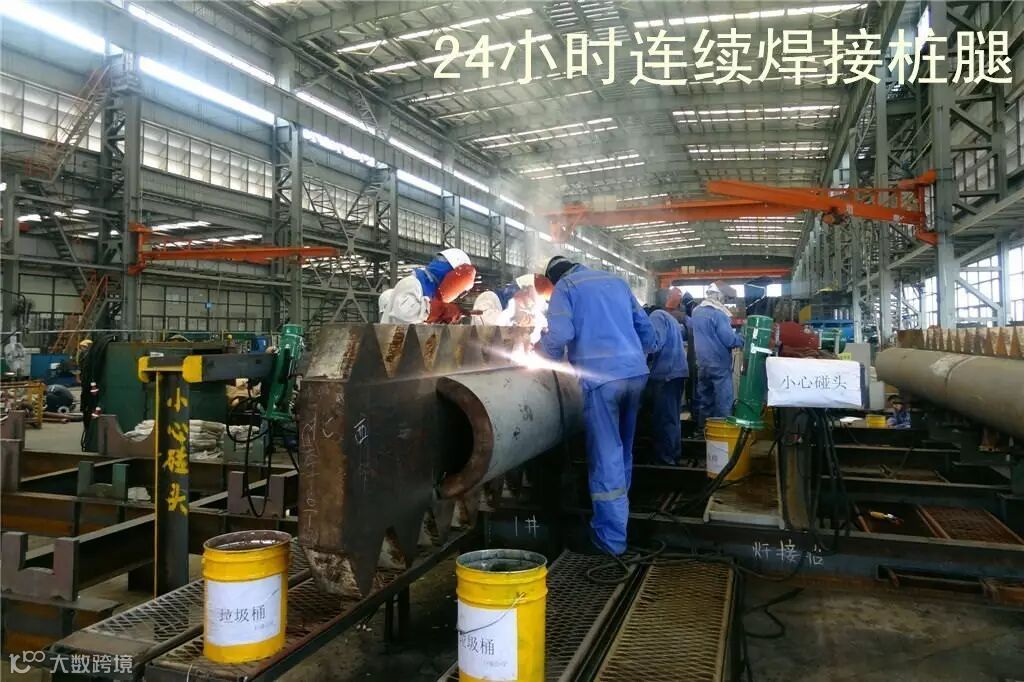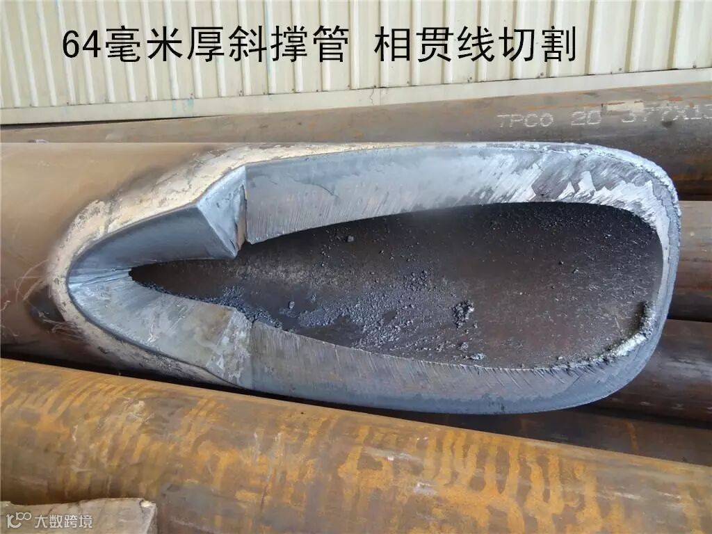 桩腿斜撑管的焊接难度更高,壁厚64 毫米的高强管,相贯线切割最大深度达到了150毫米,这是国内首次焊接制作。