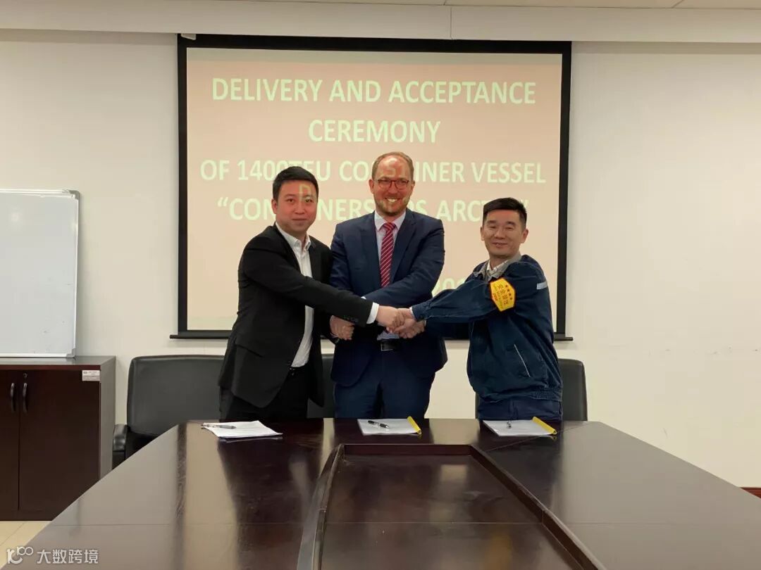 中船租赁公司代表周羽欢、船东代表Mr.Soeren Hoessermann、公司总经理助理徐青(由左至右)分别在交船文本上签字。